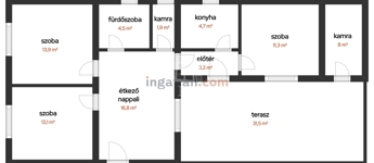 A családi ház az alábbi helyiségekből áll: nappali/étkező 16,8 nm, szoba 13,1 nm, szoba 13,9 nm, szoba 11,3 nm, konyha 4,7 nm, fürdőszoba 4,5 nm, kamra 1,9 nm, előtér 3,2 nm, kamra 8 nm, fedett terasz 31,5 nm.