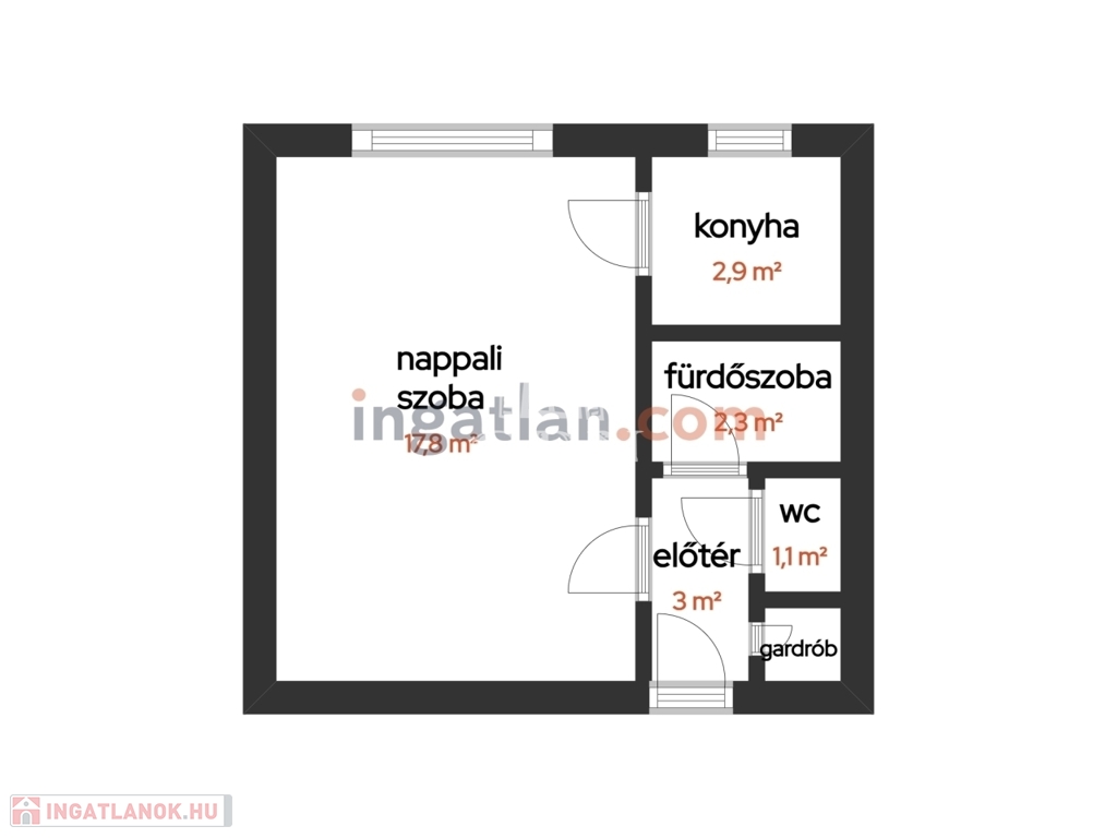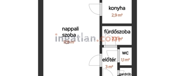 Elosztása: előtér 3 m2, nappali/háló 17,82 m2, fürdőszoba 2,27 m2, konyha 2,89 m2 wc 1,2 m2.
