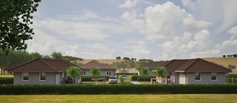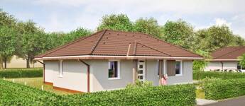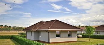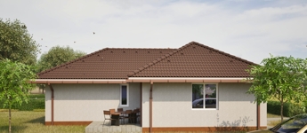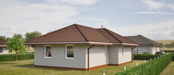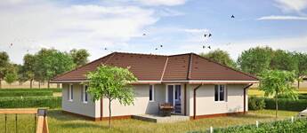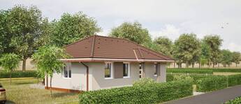 A ház helyiségei: amerikai konyhás nappali, 3 hálószoba, fürdő WC-vel, külön WC, kamra, háztartási helyiség, gardrób, előszoba, közlekedő, előtér, fedett előtér.