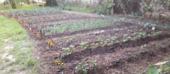Az ingatlan körül udvar, mögötte veteményeskert, majd gyümölcsös, és utána füves terület