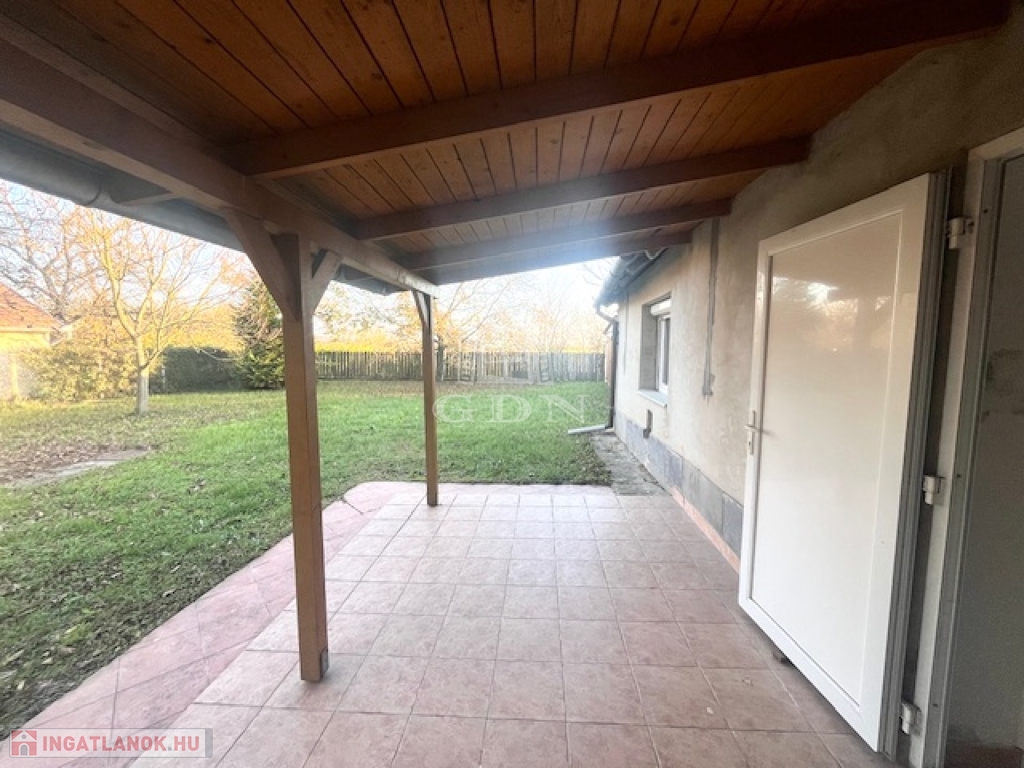 A házhoz tartozik egy 16 m2-es, fedett, járólapozott terasz, melyről csendes, nyugodt kilátás nyílik az udvarra, tökéletes helyszín a reggeli kávézásra vagy egy esti borozásra.