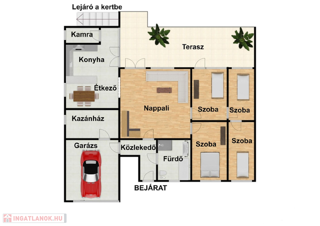 A földszinten helyezkedik el a lakrész a garázzsal, kazánházzal és egy 30nm-es, napfényes terasszal.