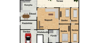 -140nm-es családi ház(konyha, nappali, 3 szoba, előszoba, fürdőszoba, kamra, kazánház) mellett 30nm-es terasz, 20nm-es garázs és a pinceszinten 42nm-es műhely(tároló)