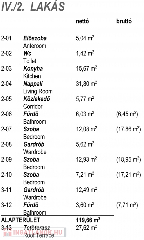 A 147m2-es értékesítési alapterület tartalmazza a nettó 120m2-es lakótéren felül 190cm alatti területek (26m2) és a terasz (28m2) területének 50%-át.