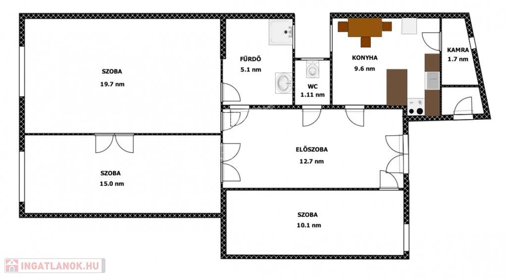 Elosztása: 3 külön nyíló szoba, konyha, fürdőszoba és külön WC.