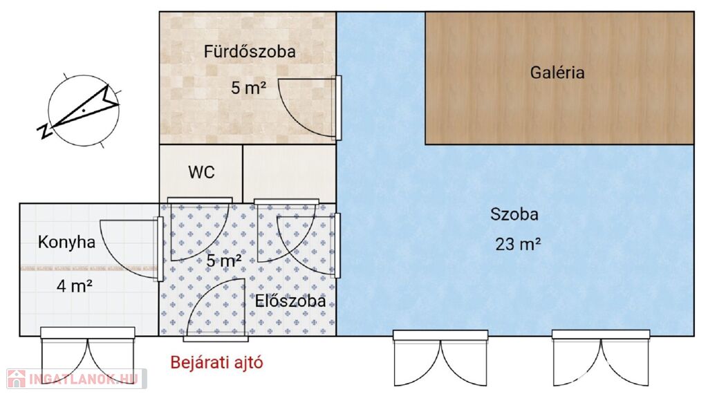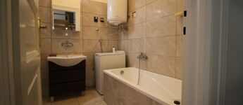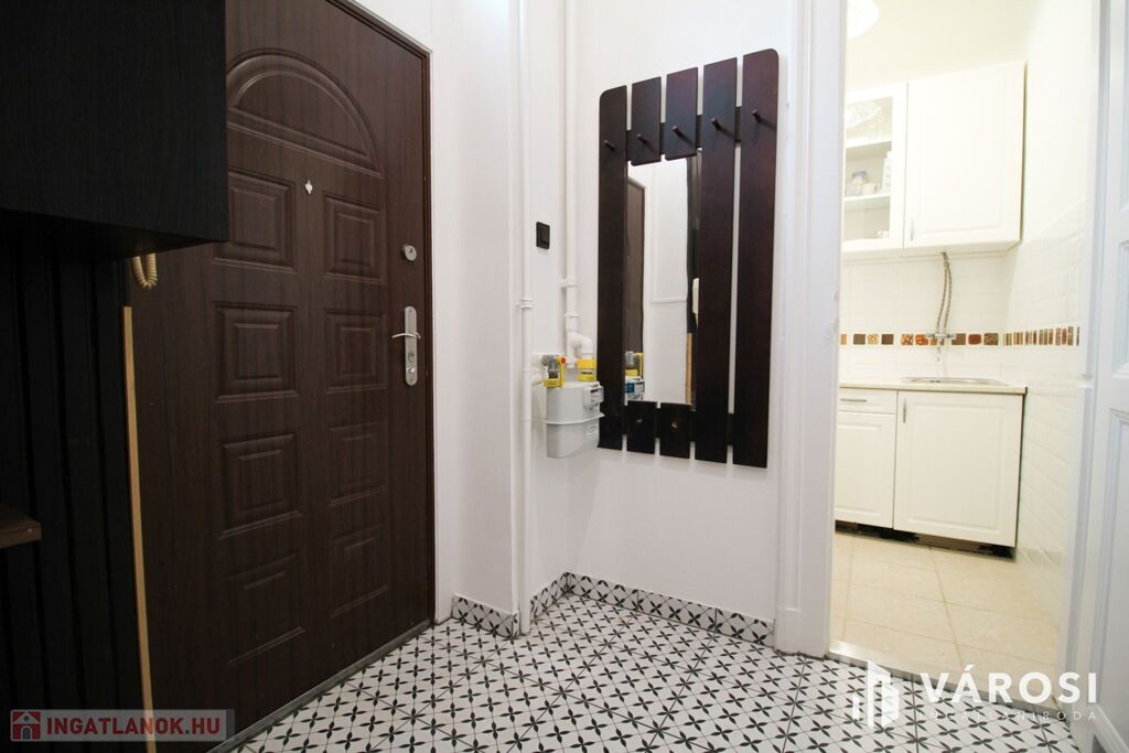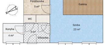 A galériás szoba tágas és világos. Az vidám parkettás előszobából nyílik a napfényes konyha, egy tároló, ahol a hűtő kap helyet, és a mosdó, amely külön van a fürdőkádas fürdőszobától. A lakás nem bútorozott, tehát a bérlő önmaga döntheti el, hogyan szeretné berendezni az életterét, viszont gépiesített, így azonnal is költözhető.