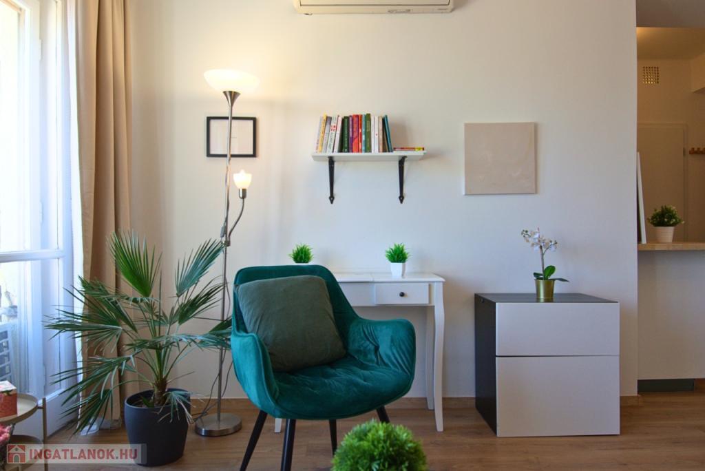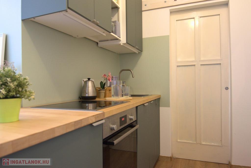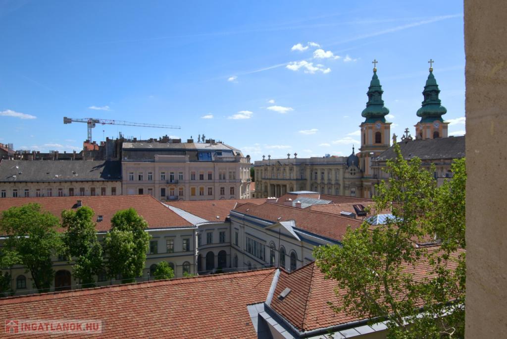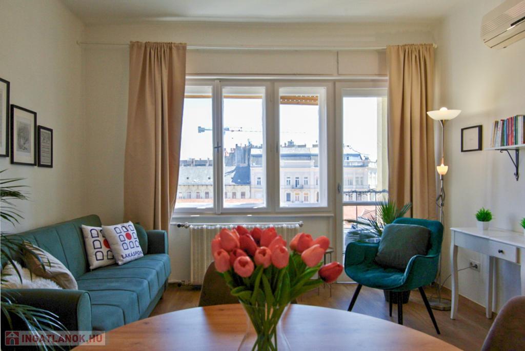 KIADÓ Budapest belvárosában az V. Kecskeméti utcánál, csendes mellékutcában, felújított liftes házban legfelső, 6. emeleti (felette padlás van) 35nm-es felújított, légkondicionált 1 nappali 1 hálós, bútorozatlan, IGÉNY ESETÉN BÚTOROZOTTAN -gépesített, franciaerkélyes lakás. Jelenleg bérlő lakik a lakásban, aki június 7-én költözik ki. A három évvel ezelőtti felújítás során minden vezeték cseréje megtörtént és új bútorok kerültek beépítésre. Konyhában villanytűzhely sütővel, elszívó és mosogatógép lett beszerelve, a hálóban beépített gardrób található, ezenkívül kb 4 nm-es tároló is tartozik a lakáshoz. Tökéletes a lokáció, az ingatlan a Károlyi utcában van, ablakai a Károlyi-kert felé és a Petőfi Irodalmi Múzeumra néznek. Nyugodt élettér, ugyanakkor az Egyetemek közelsége teszik vonzóvá, a Duna part, a híres Fővám téri vásárcsarnok, az Egyetem tér, a Váci utca nyüzsgő, élettel teli forgataga pár perc sétával elérhető. A környék infrastruktúrája kitűnő, mindenhol éttermek, kávézók , bevásárlási lehetőségek. A közlekedés Pest és Buda irányába is kiváló, a Kálvin téren a 3-as, 4-es Metró, a 47, 49-es villamos és számos buszjárat található. Alacsony rezsivel fenntartható, a házközponti fűtés díja, a vízdíj és a közös költség mindössze 21.000Ft./hó, ezen felül csak a villany fizetendő mérés és fogyasztás alapján. Megtekintés rugalmas.