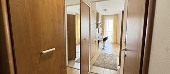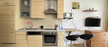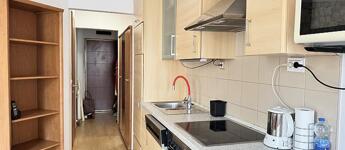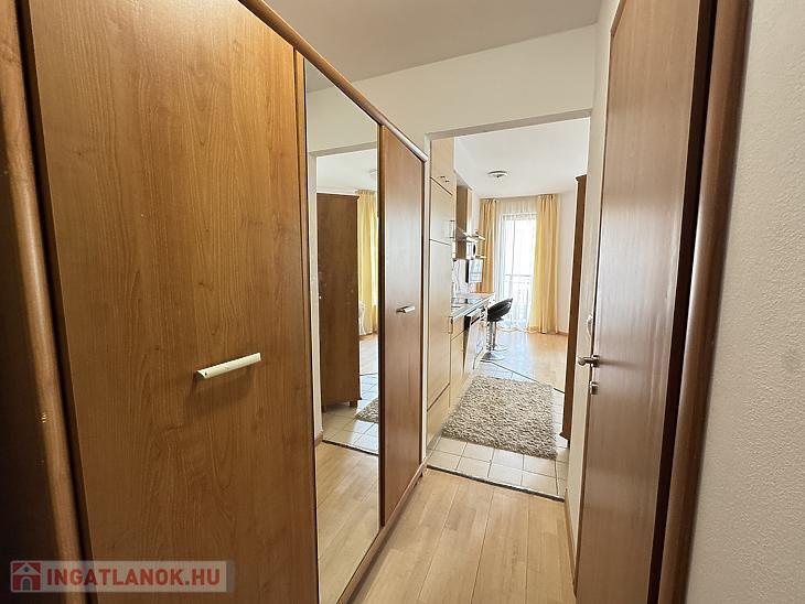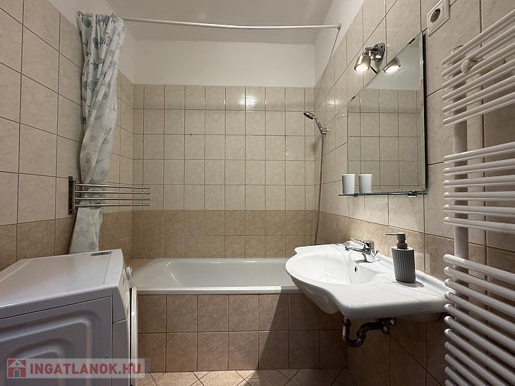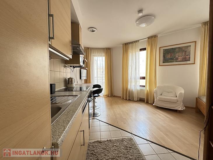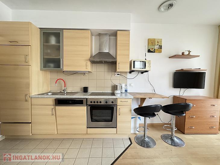 A lakás teljesen bútorozott és gépesített, minden szükséges eszközzel felszerelve: mosógép, mosogatógép, mikrohullámú sütő, beépített hűtő és fagyasztó is a bérlő rendelkezésére áll. A nappali, étkező és konyha egy légtérben helyezkednek el, emellett külön fürdőszoba és előszoba is van. A lakás mérete és kialakítása miatt leginkább egyedülállóknak ideális.