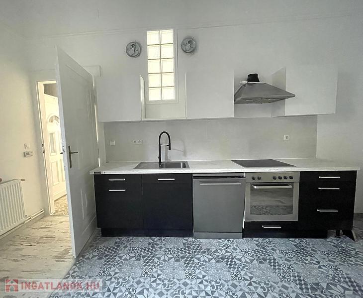 A lakás bútorozatlan, de teljesen gépesített – modern konyhával, sütővel, mosogatógéppel, hűtővel és mosógéppel felszerelt.