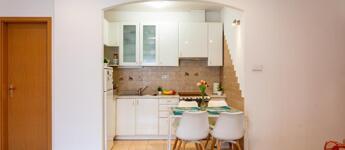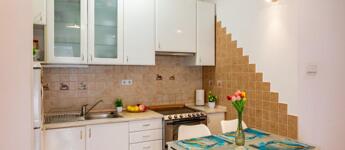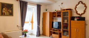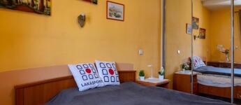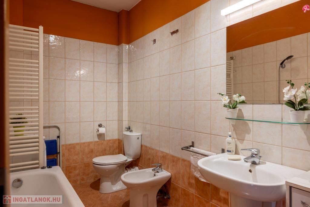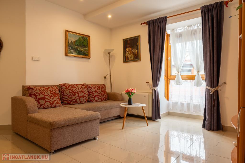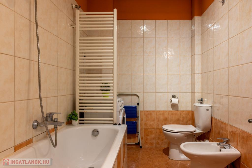 ház IV. emeletén egy 72 nm-es amerikai konyhás + nappalis, 2 hálószobás, 2 fürdőszobás, bútorozott, gépesített lakás.