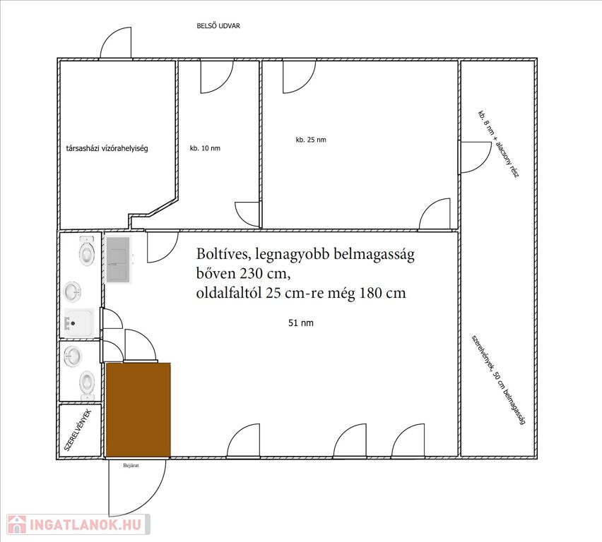 A mennyezet boltíves, belmagasság a mennyezeti lámpasorig bőven 230 cm, a faltól 20-30 cm-re még kb. 180 cm.