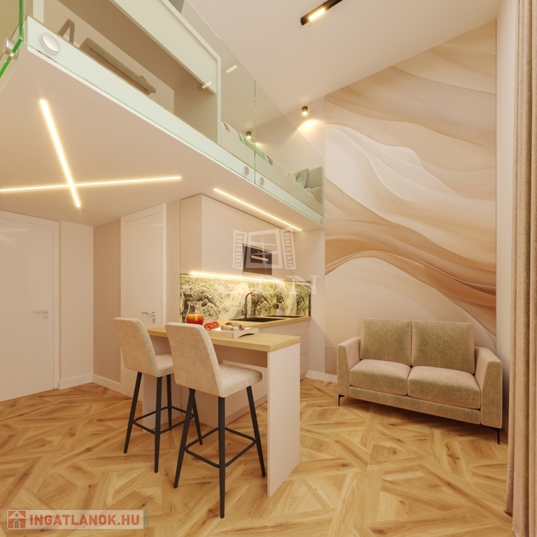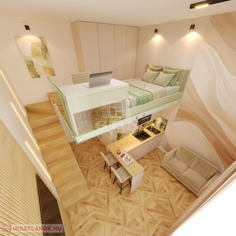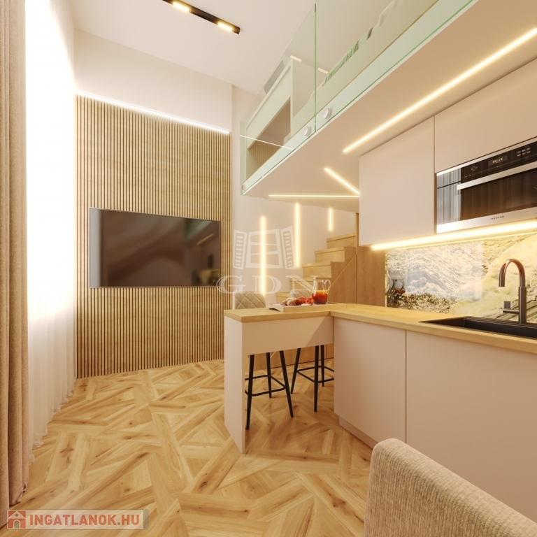 A lakás minden részlete átgondolt: a praktikus kialakításnak és a kényelmes galériának köszönhetően a tér meglepően tágas érzetet nyújt. A galéria ideális hálórésznek, így a nappali élettér teljes egészében kihasználható marad. A modern felújítás során minőségi burkolatok, letisztult design és helytakarékos megoldások kerültek beépítésre – itt valóban minden centiméter a kényelmet szolgálja.