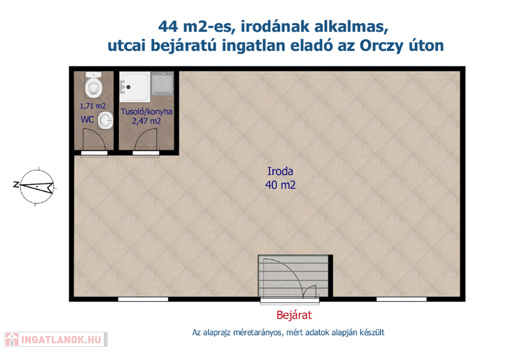 A fotók között látható alaprajz szerinti elrendezésben a 44 m2-es térből leválasztásra került egy mosdó és egy tusoló/konyha funkciót ellátó helyiség, amelyek egy iroda vagy üzlet funkcionális és higiéniai szempontjainak teljesen megfelelnek.
