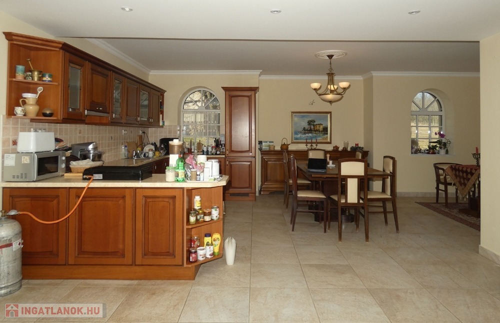 A 145 m2-es földszinten egy télikerten kersztül léphetünk a közlekedőbe, ahonnan megközelíthető a tágas, jól benapozott nappali, a konyha-étkező, kamra, a dolgozószoba, és egy hálószoba külön fürdőszobával és gardróbbal.