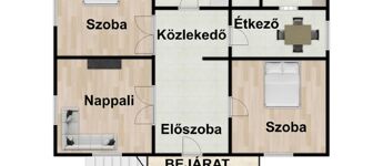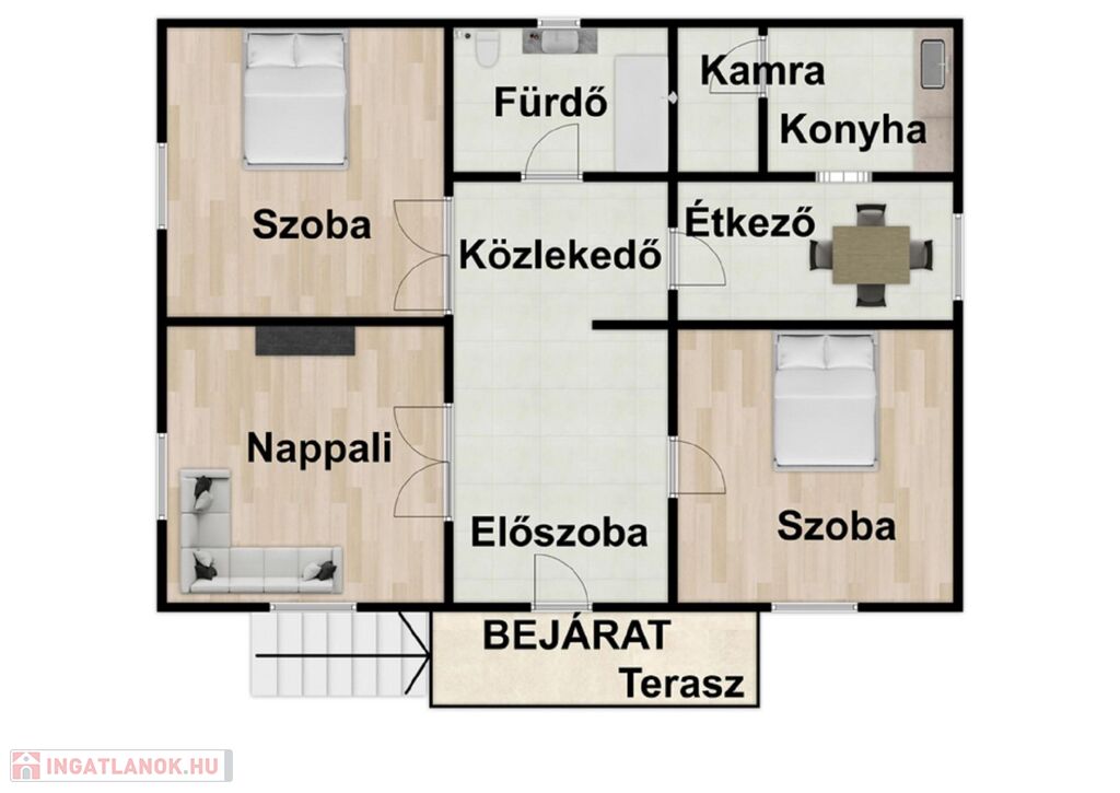 -összesen 110nm-es( konyha, fürdőszoba,nappali, 2 lakószoba, előszoba, közlekedő és egy kamra) 5nm-es fedett terasz
