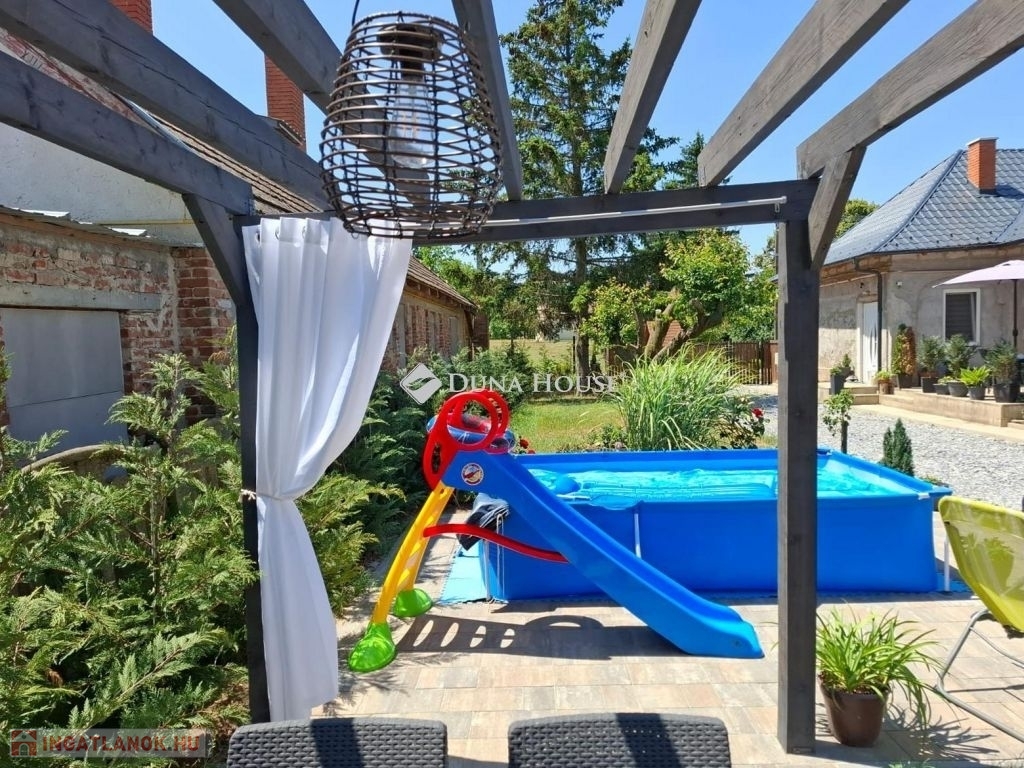 Az 55 cm vastag falazat kiváló hőtartást biztosít. A külső színezés és a terasz burkolatának befejezése az új tulajdonos ízlésére vár.