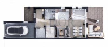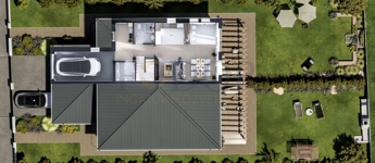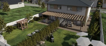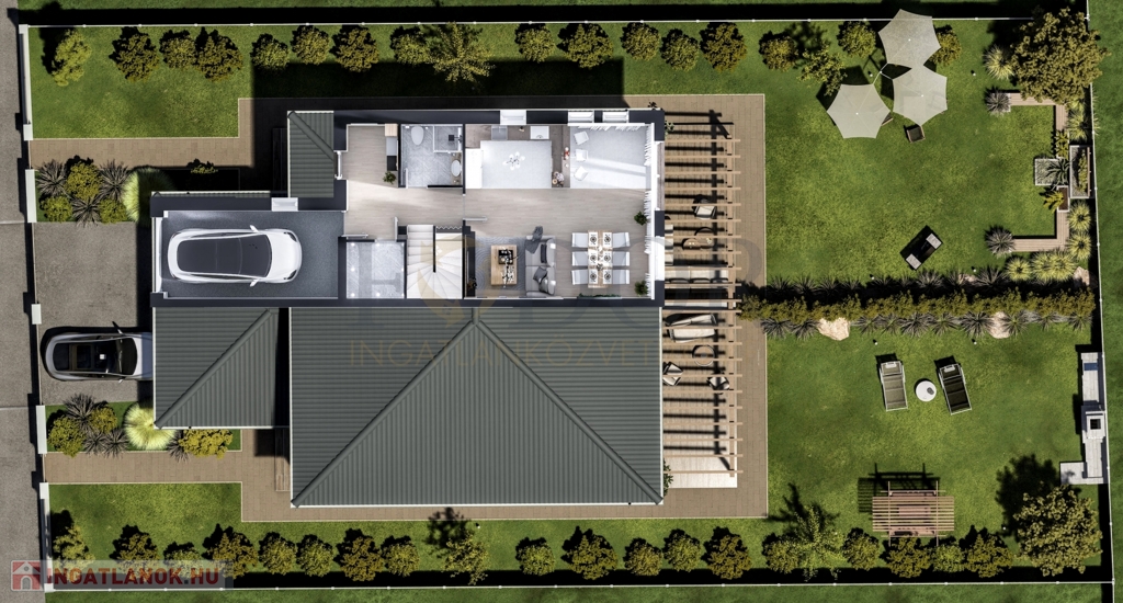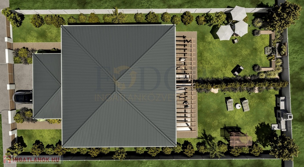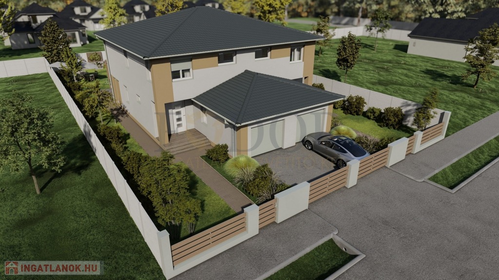 A 849 m²-es telken épülő ingatlan mindkét fele saját, 424 m²-es leválasztott telekrésszel rendelkezik, valamint egy viacolorral burkolt kocsibeállóval is ellátott.