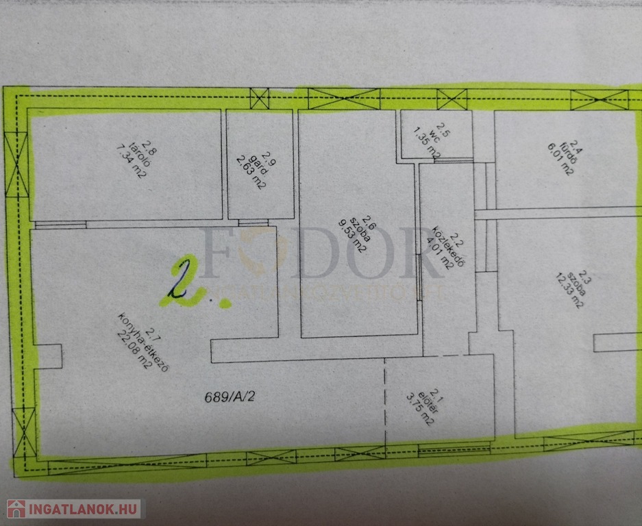 • Udvar felőli lakás: Nyélen keresztül megközelíthető, nettó 69 m² alapterületű, 3 szobás lakás, amelyhez 500 m² saját telekterület tartozik.