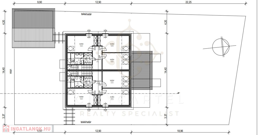 A telek kiváló adottságainak köszönhetően egy kétlakásos ház építhető rá, amelyhez már elkészült egy tanulmányterv is. A terv úgy lett kialakítva, hogy a szomszédos, hasonló méretű telekre is alkalmazható, így amennyiben a vevő a melletti telket is megvásárolja, akár 4 lakás is építhető.
