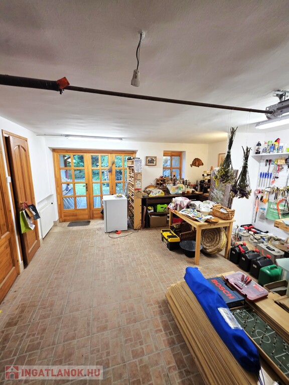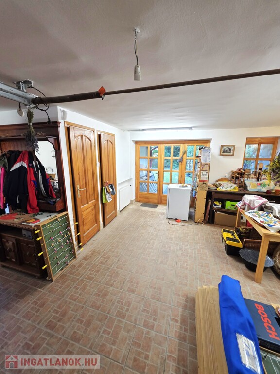 Földszint: Étkező/nappali, innen tudunk felmenni az emeletre, valamint a lenti hálószoba és fürdőszoba is innen nyílik. Mosókonyha, mellékhelyiség, garázs vagy műhely, ez a helyiség könnyen szobává is alakítható, innen 2 kisebb tároló nyílik. Innen az udvar hátsó részére teraszajtó nyílik.