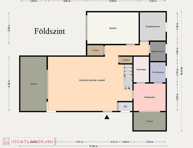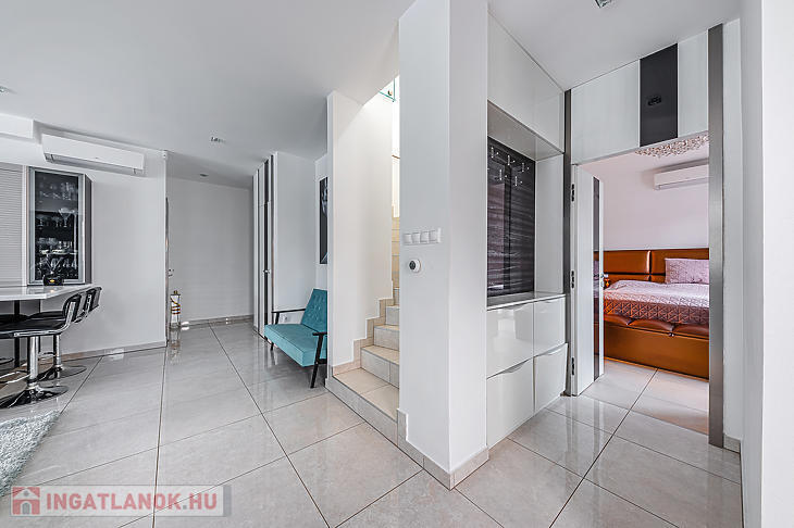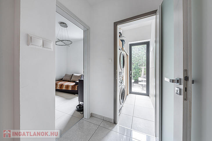 A földszinten, a bejárati ajtón belépve egy rendkívül tágas amerikai konyhás nappaliban találjuk magunkat – ez a ház központi része, ahonnan bármelyik helyiségbe kényelmesen eljutunk. Itt található a szülői háló, amelyhez privát fürdőszoba és gardróbhelyiség tartozik, továbbá egy dolgozószoba, mosókonyha, tárolóhelyiségek, vendégmosdó és közvetlen megközelíthetőség a garázshoz is. A földszinti helyiségek java részéből a kert közvetlenül elérhető. A felső szinten kettő hálószoba és egy fürdőszoba található. Az egyik szoba 15 négyzetméteres terasszal rendelkezik.