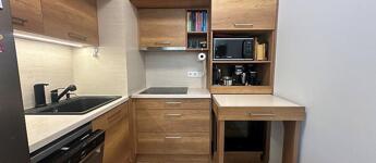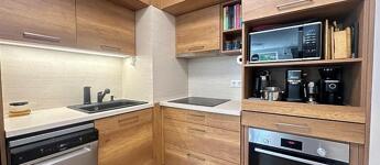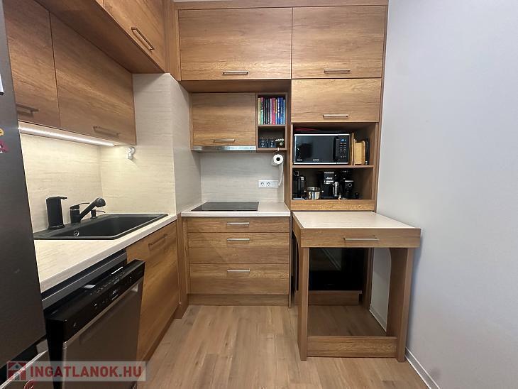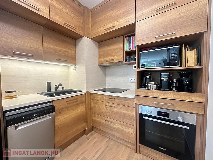 A lakás egyik kiemelt értéke az egységesen, átgondolt koncepció mentén kialakított, beépített bútorzat, amely esztétikailag és funkcionálisan is magas színvonalat képvisel. A konyha teljeskörűen gépesített.