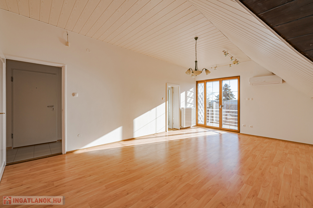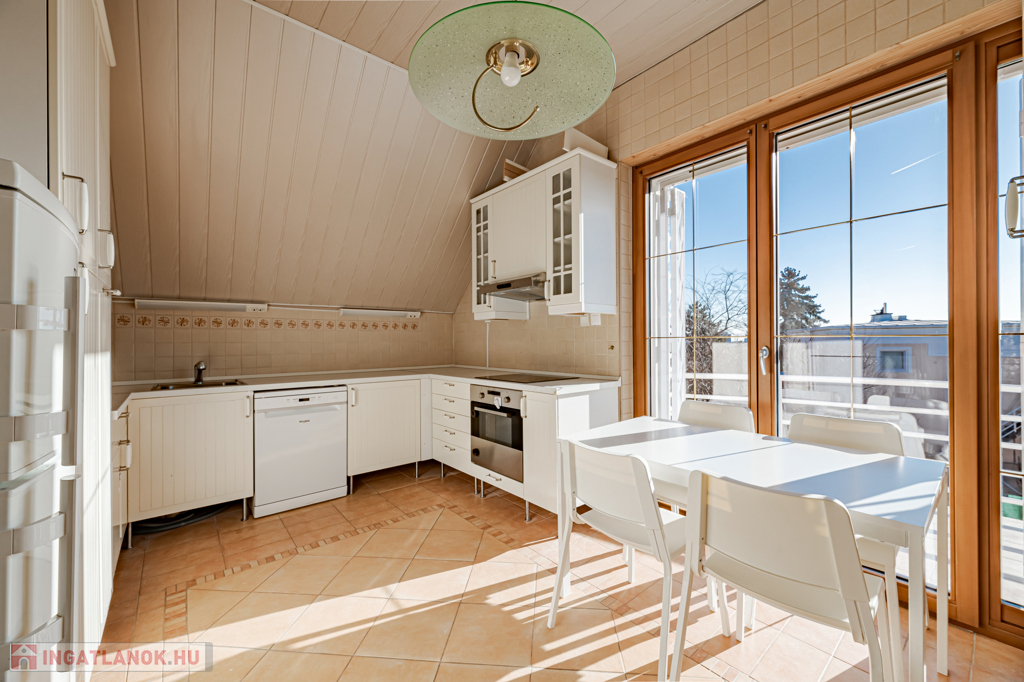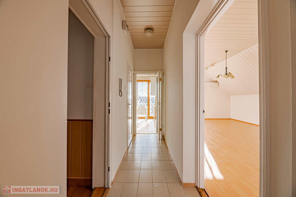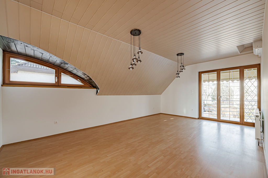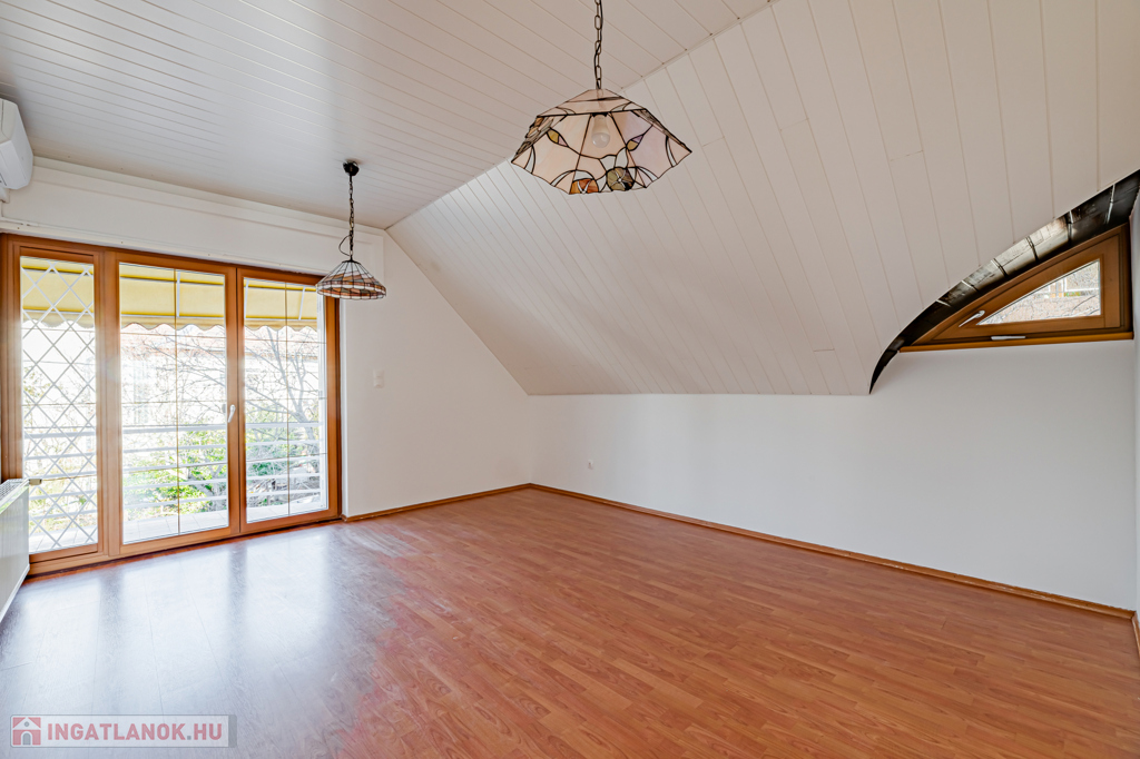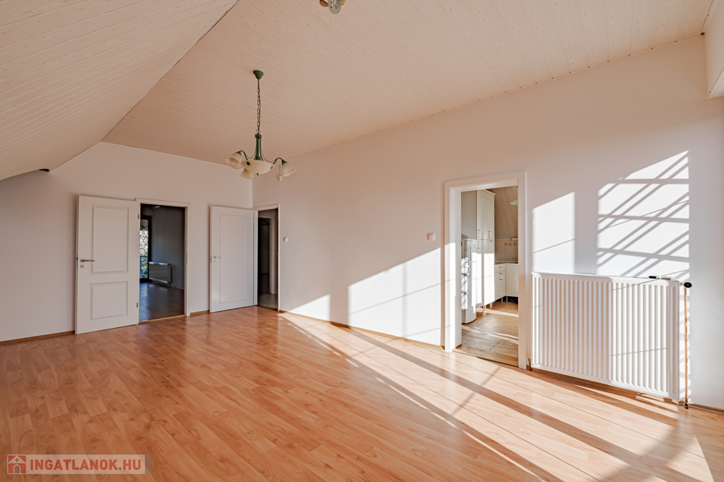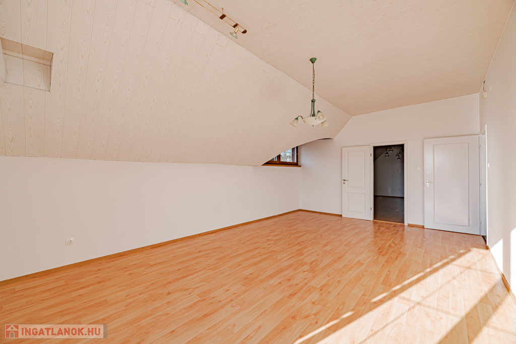 Emelet: 100 m²-es, 3 szobás tetőtéri lakás külön konyhával, fürdőszobával és WC-vel.