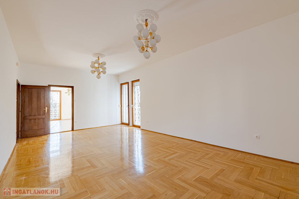 Földszint: 100 m²-es, 3 szobás lakás külön konyhával, fürdőszobával és WC-vel.