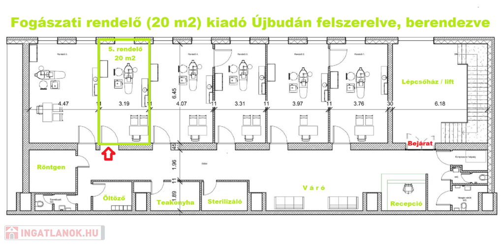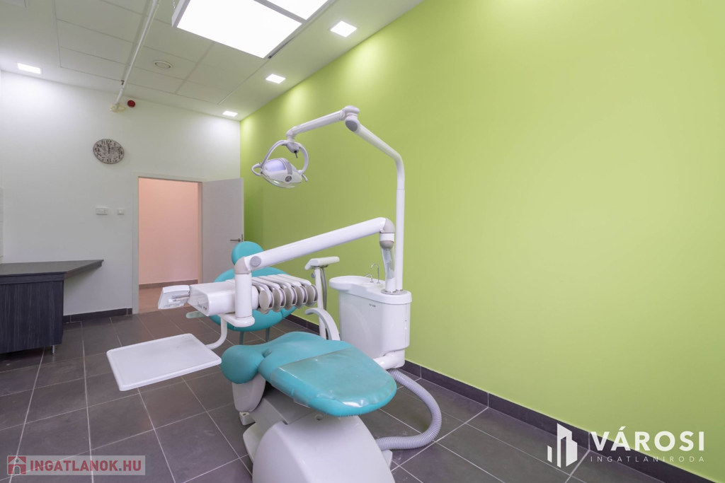 A komplexumban egymás mellett 6 rendelő kiadó, ez a rendelő 20,5 m2 alapterületű, teljesen felszerelt, Optimal 09 kezelőegységgel, fogászati eszközökkel és rendelői bútorzattal ellátott.
