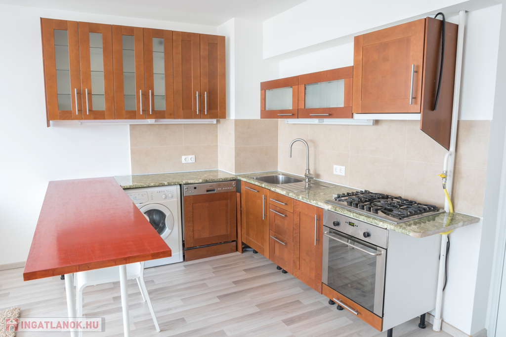 Amerikai konyhás nappali van, a konyhabútor állapota igazán szép, beépített mosogatógép szolgálja az ottlakók kényelmét. A padlóburkolat vízálló laminált padló és járólap.