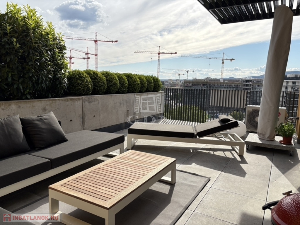 A lakáshoz dél–nyugati tájolású, privát napozóterasz tartozik, felsőkategóriás kerti bútorokkal, napernyővel, és lenyűgöző panorámával a budai hegyek felé. A terasz teljes intimitást biztosít, a növényeket automata öntözőrendszer látja el.