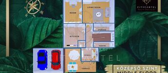 Középső szint: előtér, konyha, kamra, közlekedő, gardrób, vendég-WC, szoba, nagy nappali, terasz