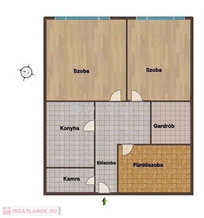 -praktikus elrendezés: előszoba, konyha, bejárható gardrób, kamra, fürdőszoba WC-vel.