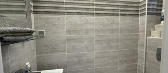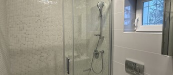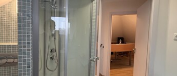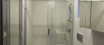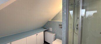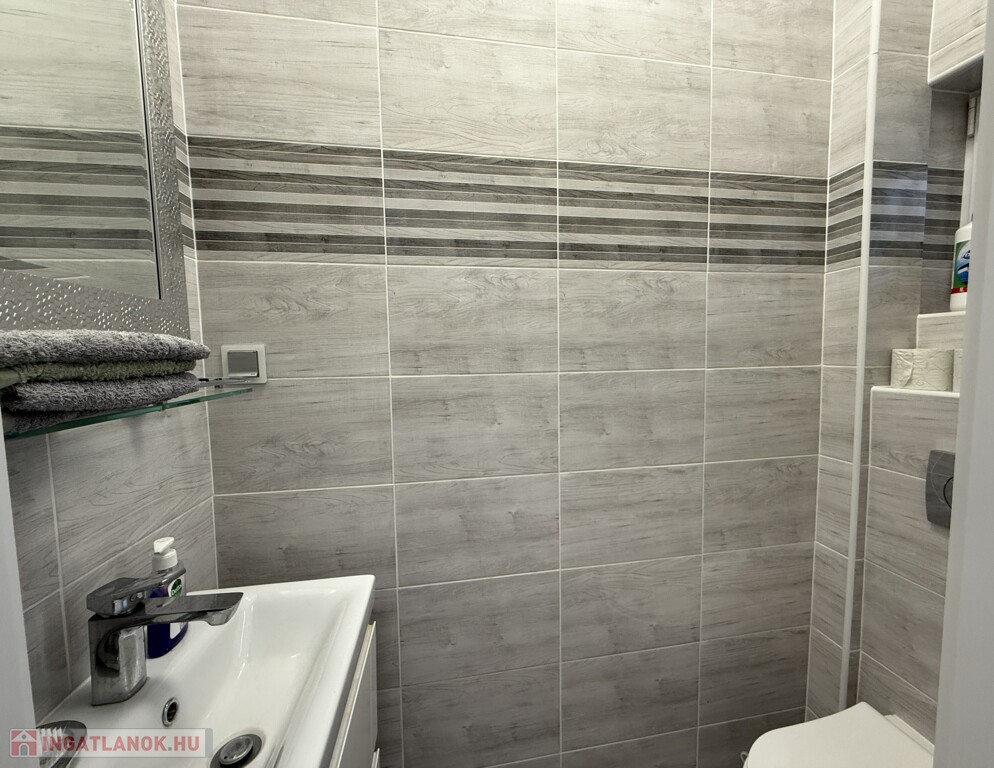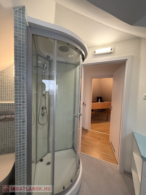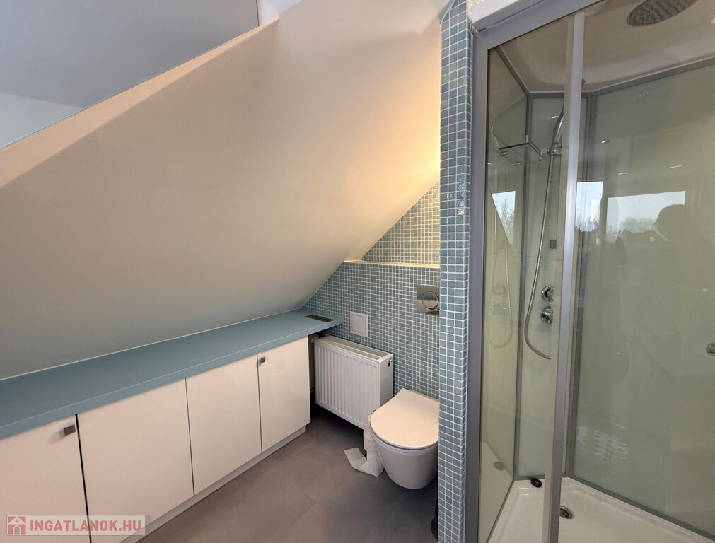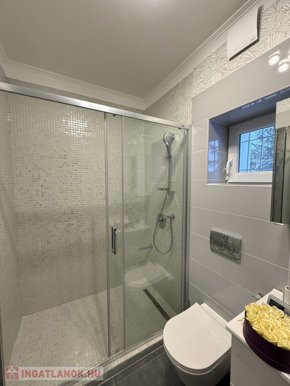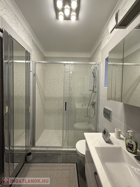 • elegáns természetes fénnyel megvilágított fürdőszoba zuhanyzóval és wc-vel, mosdó szekrényekkel,