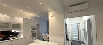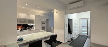 • an elegant, large kitchen area connected to the living space with a breakfast/dining bar, fitted with large built-in kitchen cabinetry and appliances; windowed dining area (17,4 sqm) with a walk-in wardrobe/closet,
