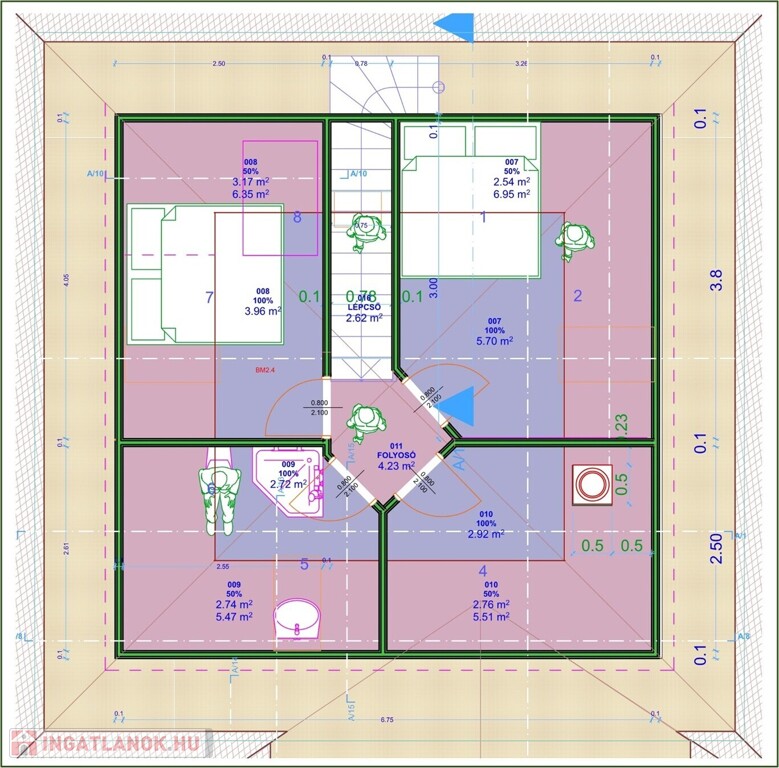 • központi közlekedőből nyíló 1 szoba (8,2 nm 1.90m feletti alapterülettel) plusz 2 félszoba (kb. 6-6 nm 1,90m feletti alapterülettel) tetőtéri ablakokkal, utóbbiak akár dolgozó szobaként,