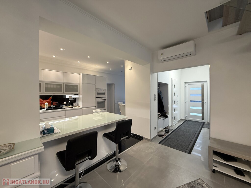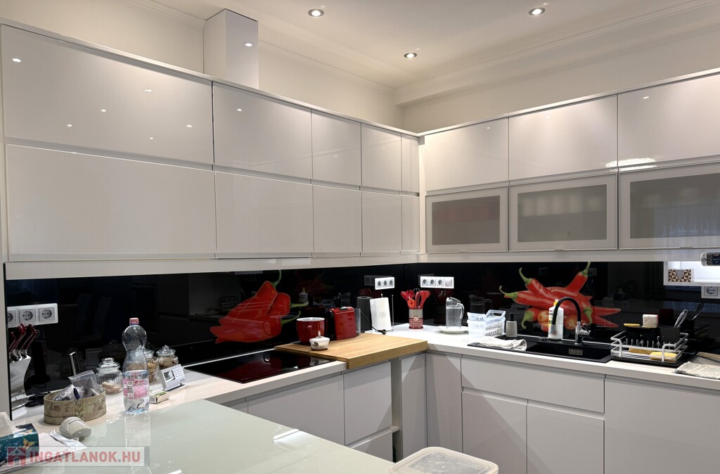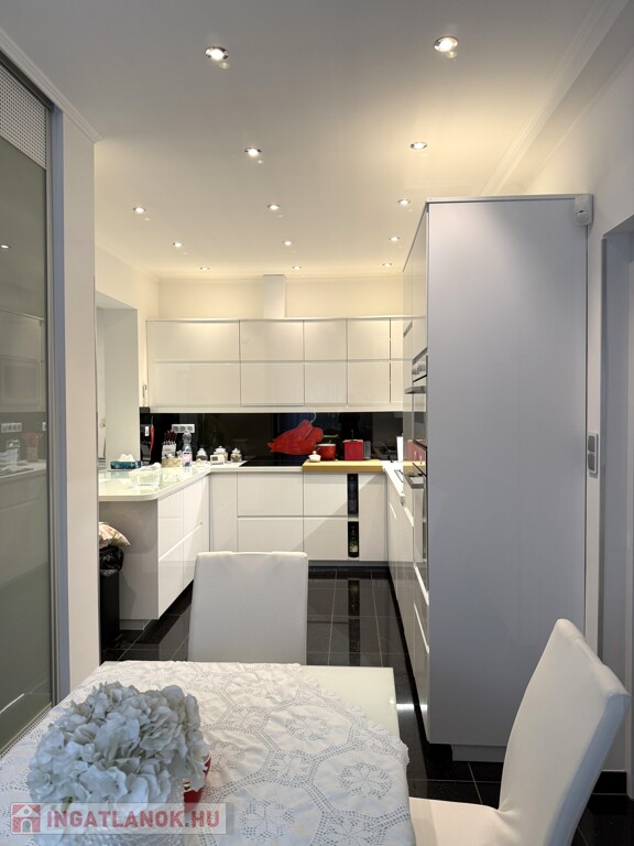 • a nappali térhez étkező pulttal csatlakozó elegáns nagy konyhatér nagyméretű beépített konyhabútorral és konyhagépekkel felszerelten, ablakos étkező térrel (17,4 nm) gardróbbal,