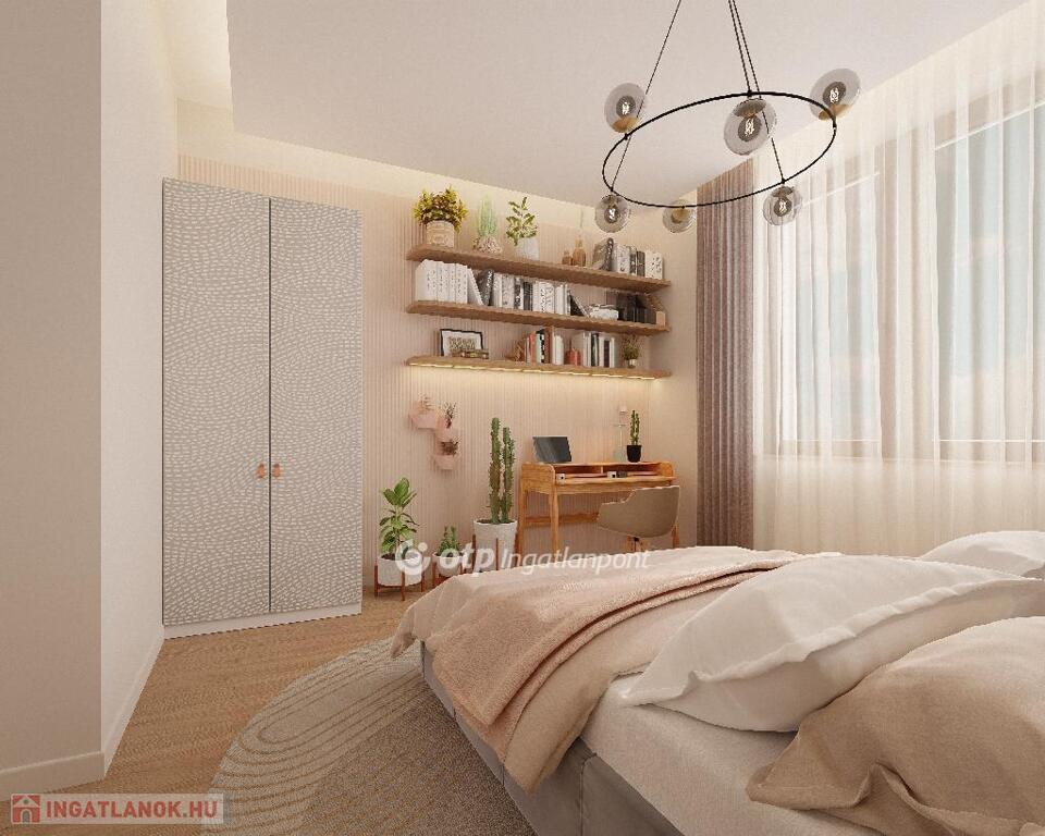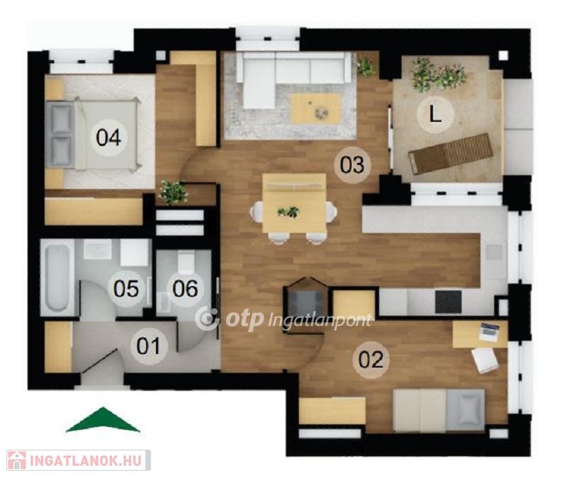 A lakás helyiségei: Előszoba, WC, Szoba, Amerikai konyhás nappali, Szoba, Fürdőszoba.