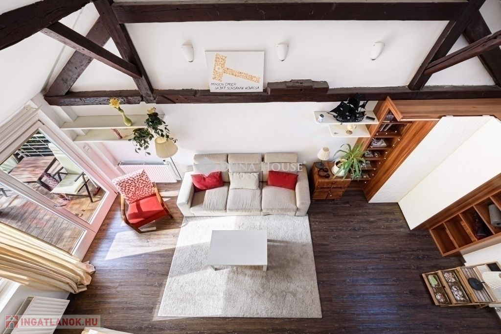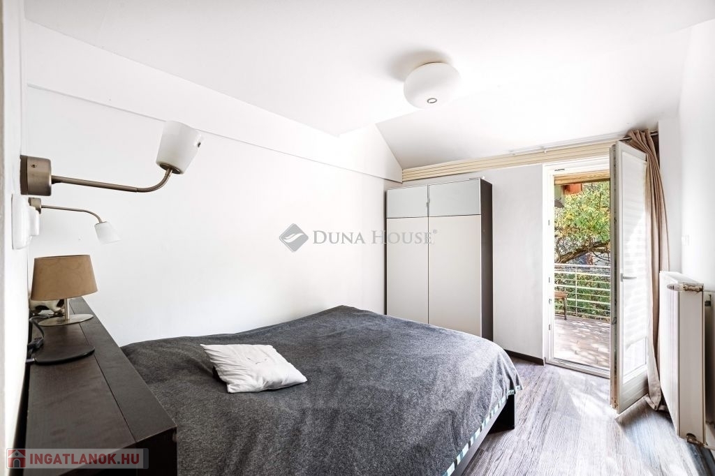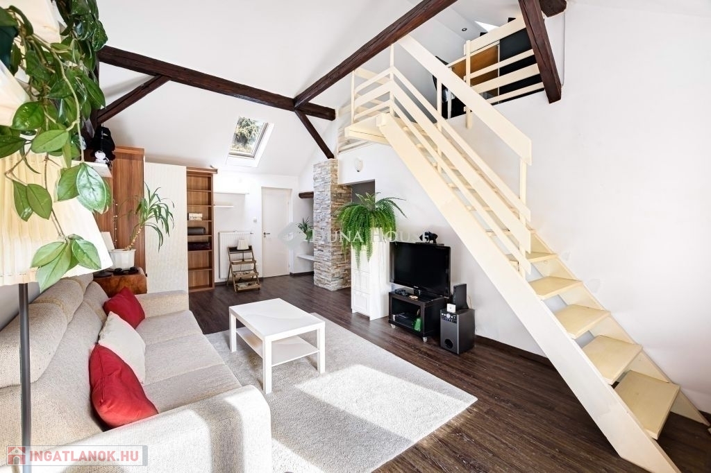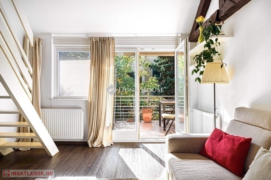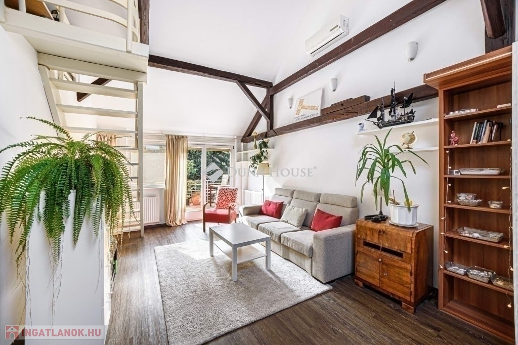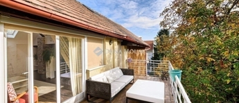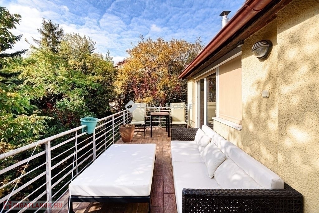 Napsütötte, tágas, teraszos otthon - KissvábhegyenBudapest egyik legkedveltebb, zöldövezeti részén, a XII. kerület Kissvábhegyén, az Ügyész utcában kínálunk megvételre egy különleges hangulatú, 80 m²-es, belső kétszintes lakást, 12 m²-es, napfényben fürdőző, kertre néző saját terasszal.A lakás egy elegáns, háromlakásos villaépület legfelső szintjén helyezkedik el, így teljes intimitást és nyugalmat biztosít tulajdonosának.A lakás különlegességei:- Lélegzetelállító terek és fényár  a 4 méteres belmagasság, valamint a rusztikus, látszó gerendás nappali egyedi karaktert kölcsönöz az otthonnak.- Kivételes tárolókapacitás  ízlésesen beépített szekrények és tágas gardrób biztosítanak rendszerezett életteret.- Csendes, zöld környezet, mégis kiváló közlekedés  a belváros mindössze percek alatt elérhető. (Busz: 21, 39, 102, 210, 212  Villamos: 17, 59, 61  M2 metró: 10 perc séta)A lakás elrendezése:- elegáns előszoba- konyha-étkező + kamra- tágas nappali rusztikus látszógerendákkal, közvetlen teraszkapcsolattal- kényelmes méretű hálószoba, szintén kijárattal a teraszra- stílusos fürdőszoba zuhanykabinnal és WC-el- a galériaszinten egy nyitott, világos dolgozó- vagy vendégszoba, beépített gardrób és extra tárolófelületekA lakás a villa felső szintjén, kb. másfél emelet magasságban található. A hozzá vezető zárható, kizárólagos használatú lépcsőház további biztonságot és extra tárolási lehetőséget kínál.A lakás teljes körű felújításon esett át, és azóta is gondosan karbantartott.Cirkófűtés és klímaberendezés gondoskodik az évszakokhoz illő kényelemről.Külső adottságok:A villa egy 1070 m²-es, ősfás, parkosított telken helyezkedik el. A lakáshoz saját kerthasználat tartozik, ahol homokozó-játszórész,  grillterasz, pihenőkert vagy veteményes is kialakítható.A kényelmet saját udvari gépkocsibeálló és külön külső tároló is szolgálja, melyek árát a vételár tartalmazza!!!Ez az ingatlan tökéletes választás azoknak, akik egy napfényes, hangulatos, otthonos lakást keresnek a XII. kerület egyik legjobb részén, ahol a zöld környezet és a városi kényelem találkozik.Ha Ön is egy egyedi atmoszférájú, magas minőségű lakásra vágyik Budapest egyik legkívánatosabb részén, keressen bizalommal a részletekért és a megtekintés egyeztetéséhez!