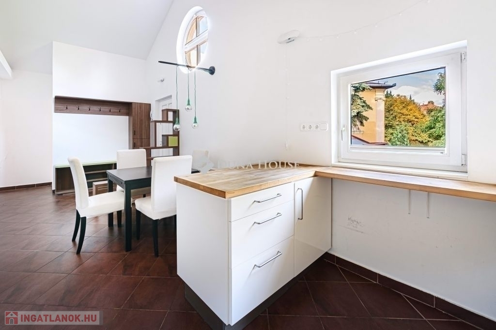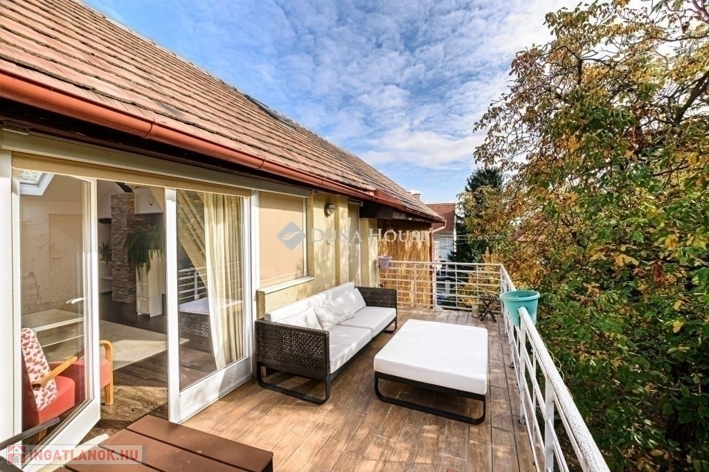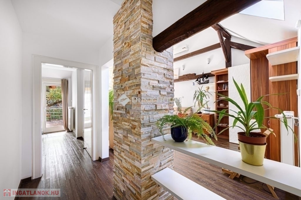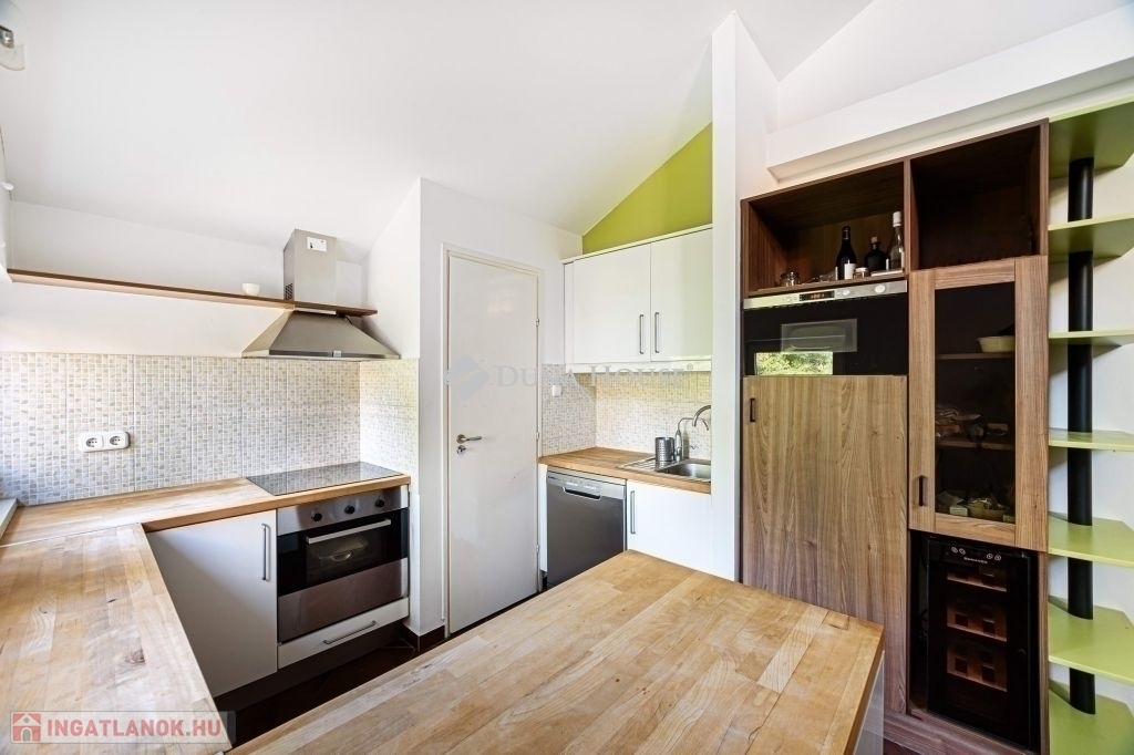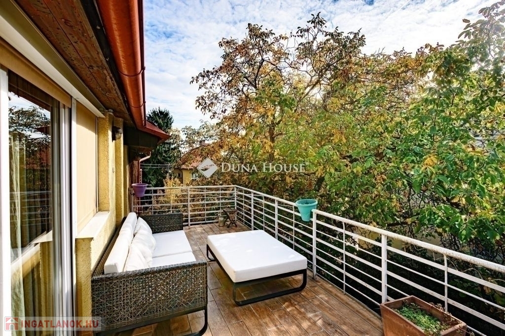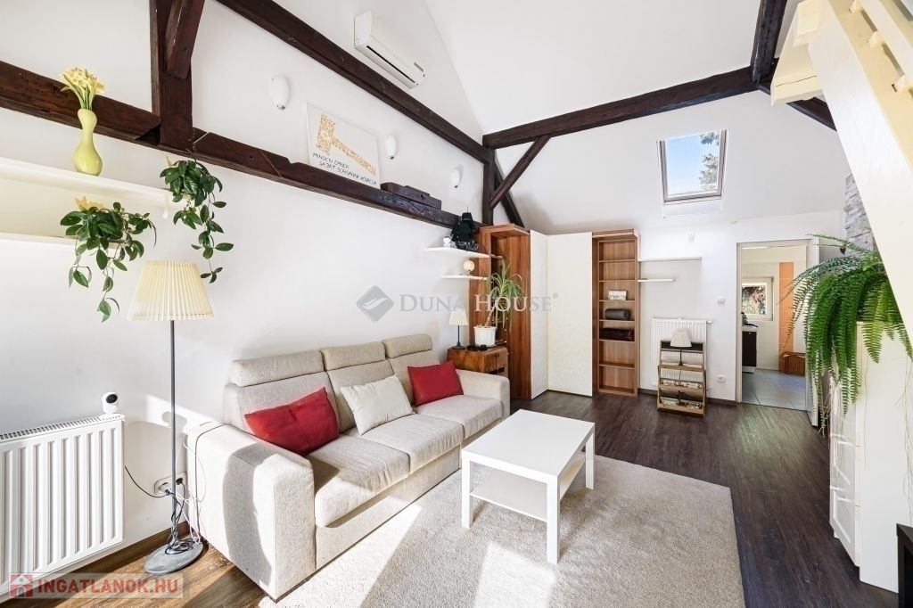 Napsütötte, tágas, teraszos otthon - KissvábhegyenBudapest egyik legkedveltebb, zöldövezeti részén, a XII. kerület Kissvábhegyén, az Ügyész utcában kínálunk megvételre egy különleges hangulatú, 80 m²-es, belső kétszintes lakást, 12 m²-es, napfényben fürdőző, kertre néző saját terasszal.A lakás egy elegáns, háromlakásos villaépület legfelső szintjén helyezkedik el, így teljes intimitást és nyugalmat biztosít tulajdonosának.A lakás különlegességei:- Lélegzetelállító terek és fényár  a 4 méteres belmagasság, valamint a rusztikus, látszó gerendás nappali egyedi karaktert kölcsönöz az otthonnak.- Kivételes tárolókapacitás  ízlésesen beépített szekrények és tágas gardrób biztosítanak rendszerezett életteret.- Csendes, zöld környezet, mégis kiváló közlekedés  a belváros mindössze percek alatt elérhető. (Busz: 21, 39, 102, 210, 212  Villamos: 17, 59, 61  M2 metró: 10 perc séta)A lakás elrendezése:- elegáns előszoba- konyha-étkező + kamra- tágas nappali rusztikus látszógerendákkal, közvetlen teraszkapcsolattal- kényelmes méretű hálószoba, szintén kijárattal a teraszra- stílusos fürdőszoba zuhanykabinnal és WC-el- a galériaszinten egy nyitott, világos dolgozó- vagy vendégszoba, beépített gardrób és extra tárolófelületekA lakás a villa felső szintjén, kb. másfél emelet magasságban található. A hozzá vezető zárható, kizárólagos használatú lépcsőház további biztonságot és extra tárolási lehetőséget kínál.A lakás teljes körű felújításon esett át, és azóta is gondosan karbantartott.Cirkófűtés és klímaberendezés gondoskodik az évszakokhoz illő kényelemről.Külső adottságok:A villa egy 1070 m²-es, ősfás, parkosított telken helyezkedik el. A lakáshoz saját kerthasználat tartozik, ahol homokozó-játszórész,  grillterasz, pihenőkert vagy veteményes is kialakítható.A kényelmet saját udvari gépkocsibeálló és külön külső tároló is szolgálja, melyek árát a vételár tartalmazza!!!Ez az ingatlan tökéletes választás azoknak, akik egy napfényes, hangulatos, otthonos lakást keresnek a XII. kerület egyik legjobb részén, ahol a zöld környezet és a városi kényelem találkozik.Ha Ön is egy egyedi atmoszférájú, magas minőségű lakásra vágyik Budapest egyik legkívánatosabb részén, keressen bizalommal a részletekért és a megtekintés egyeztetéséhez!