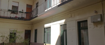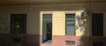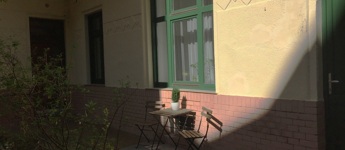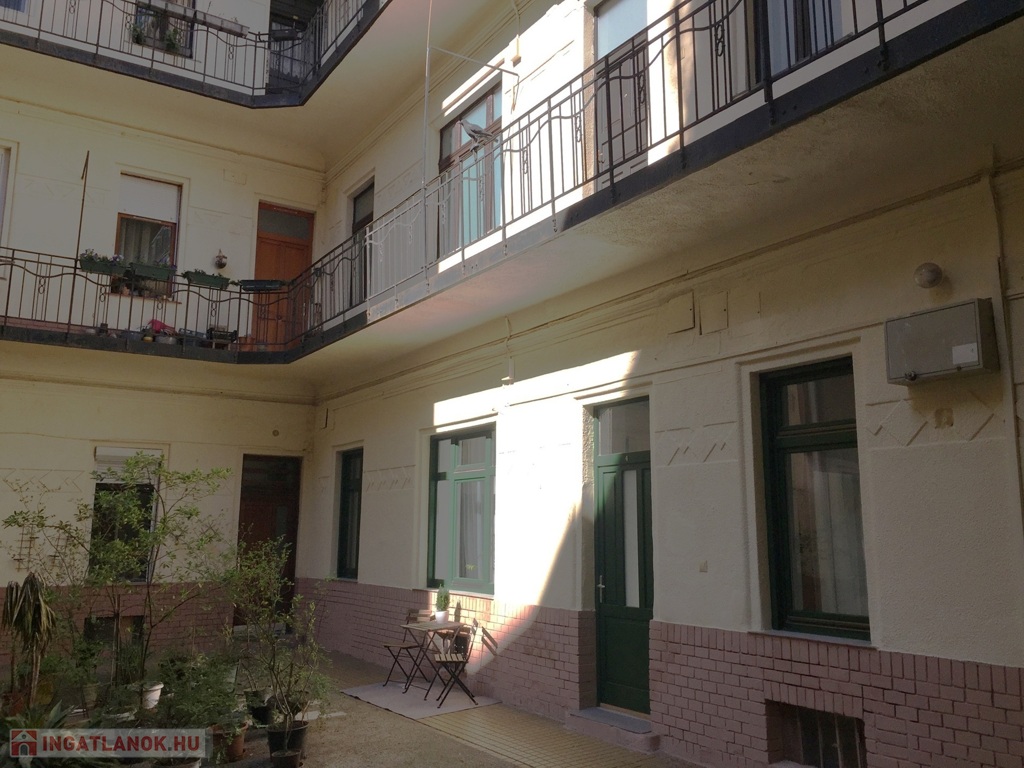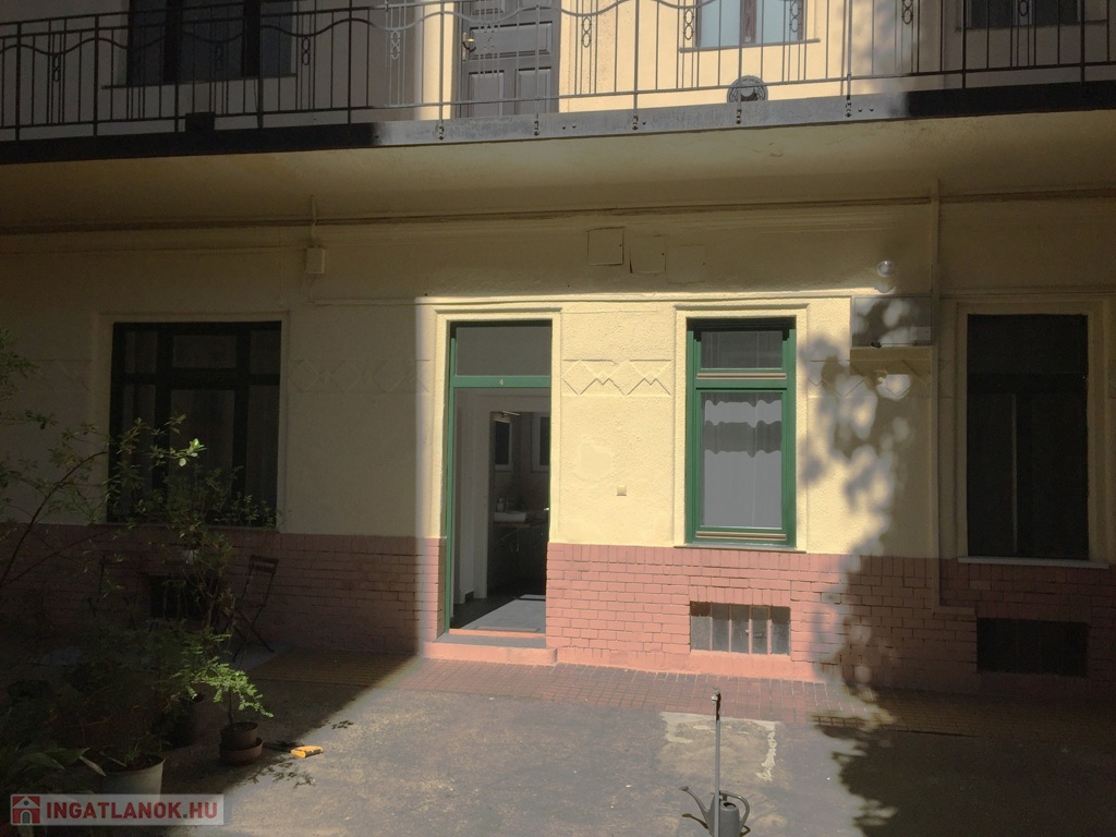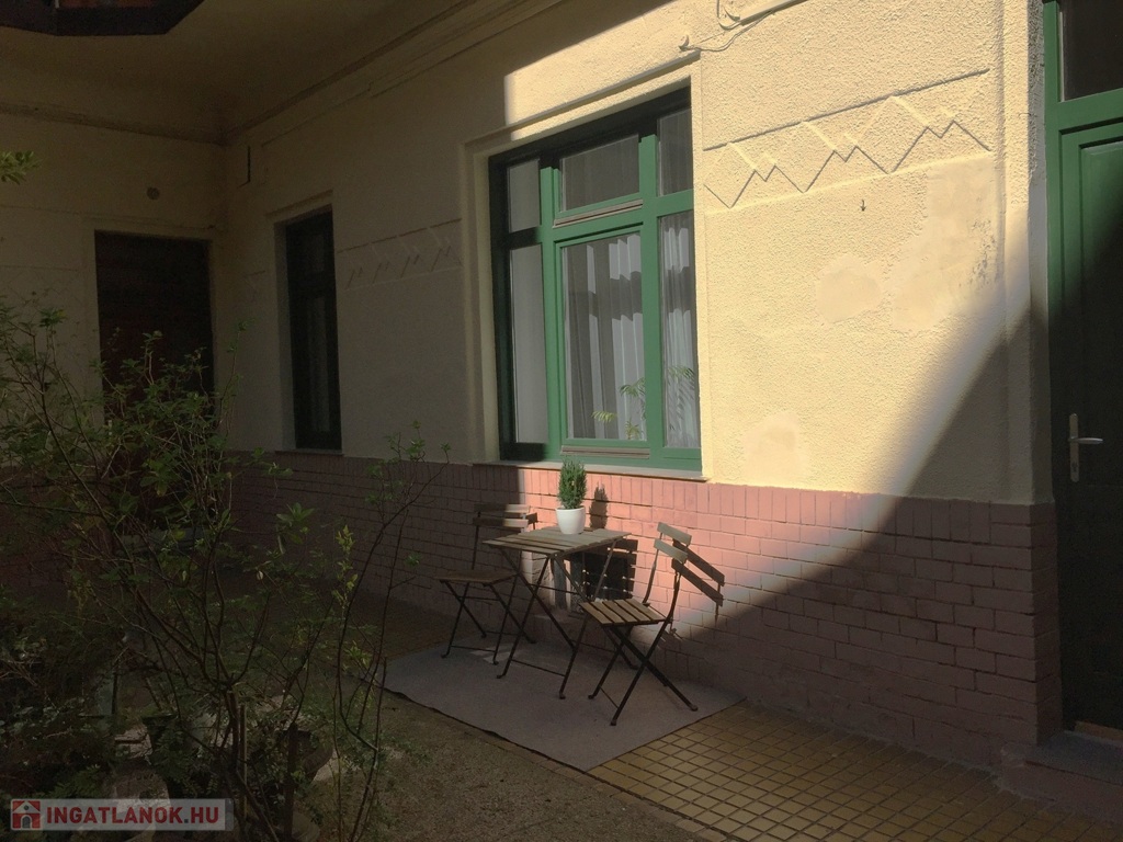 A lakás ablakai egy világos rendezett udvarra néznek.