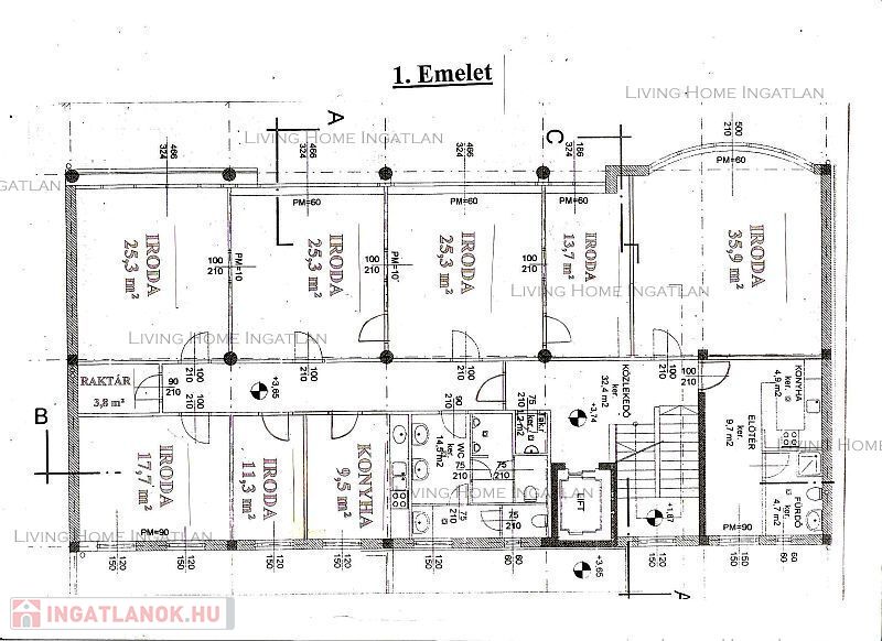 XIII. Angyalföldön 230 nm területen (lásd. alaprajz - tárgyaló, irodák, konyha és szociális helyiségek) légkondicionált iroda bérlésére nyílik lehetőség, azonnali költözéssel!
