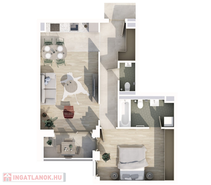 -Elrendezés: előszoba, fürdőszoba, konyha, nappali, hálószoba, WC, terasz.