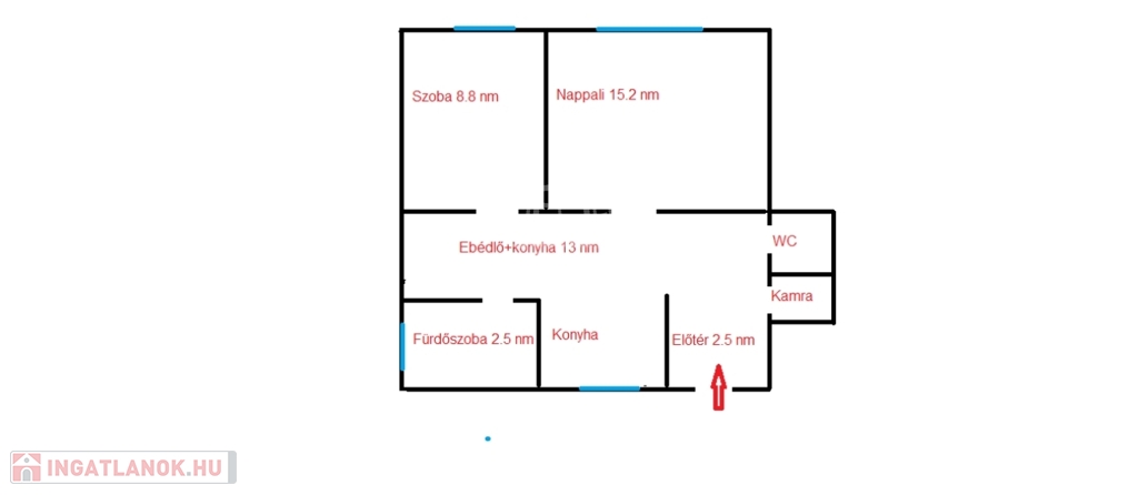 Az előtérből  érkezünk a 13 nm-es ebédlőbe  az ablakos konyhába és a két külön nyíló( 8.8-15.2 nm-es  szobába.