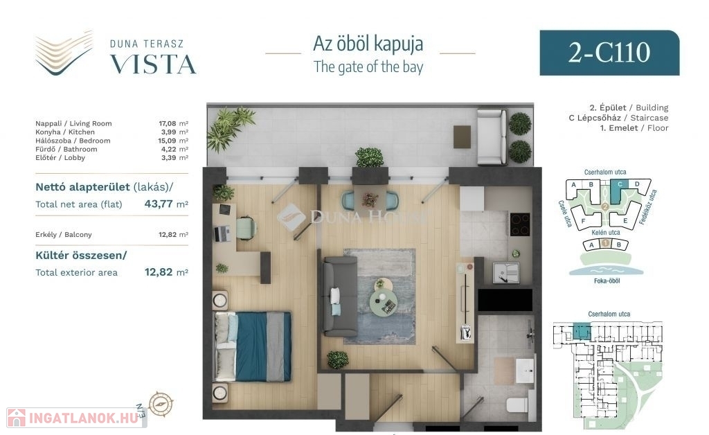 Az Öböl Kapuja!Eladó egy 2 szobás, napfényes, 44 m²-es lakás 13 m² erkéllyel Budapest egyik legexkluzívabb fejlesztésében, a Marina parton. Az ingatlan utcára néző, világos, modern kialakítású, ideális rövid- vagy hosszú távú bérbeadásra, illetve értékálló befektetésnek.-Tervezett átadás 2026 szeptemberA projekt különlegessége a vízparti elhelyezkedés, a lenyűgöző dunai panoráma, valamint a modern, hullámzó homlokzati kialakítás. A korlátozottan elérhető Duna-parti ingatlanok értéke évről évre jelentős mértékben növekszik, keresettségük miatt gyorsan és könnyedén bérbe adhatók akár prémium hozammal.Műszaki és kényelmi jellemzők:Energiatakarékos mennyezeti hűtés-fűtésRecepció, portaszolgálat és csomagpontMagas színvonalú építési minőségKözösségi szolgáltatások:Tetőteraszok napozóval, jóga- és grillfunkcióvalKözösségi nappali, kültéri és beltéri játszótérFűszerkert, pihenőpark, outdoor officeSporteszköz- és fészerraktár, kerékpártárolókPorta- és őrszolgálatLokáció és elérhetőség:A lakópark a Vizafogó városrészben épül, amely az elmúlt évek egyik legdinamikusabban fejlődő területe.Pár perc sétára a Duna-part, Marina sétány, teniszpályák, játszóterek, éttermek, kávézók, kikötők és kültéri edzőtermek.Közlekedés szempontjából is ideális: a 3-as metró, buszok, bicikliút és hajókikötő is könnyedén elérhető így a belváros akár hajóval is megközelíthető.
