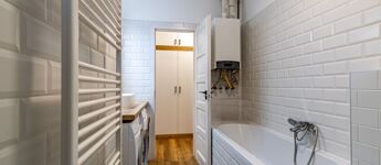 Heating and hot water are provided by a modern condensing gas boiler. The building does not have an elevator.