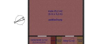 Az alaprajzon látható elrendezésben áll egy irodahelyiségből, egy előtérből, ahol beépített polcok segítenek abban, hogy az iroda rendezettek maradjon, valamint egy további, irattárnak, tárolónak alkalmas kis helyiségből.
