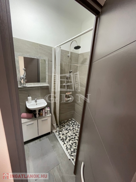 Tartozik hozzá még egy külön beépített zuhanyfülkés fürdőszoba mosdókagylóval és külön WC.