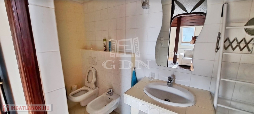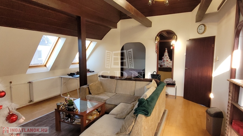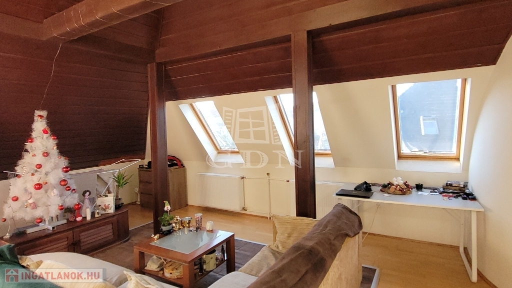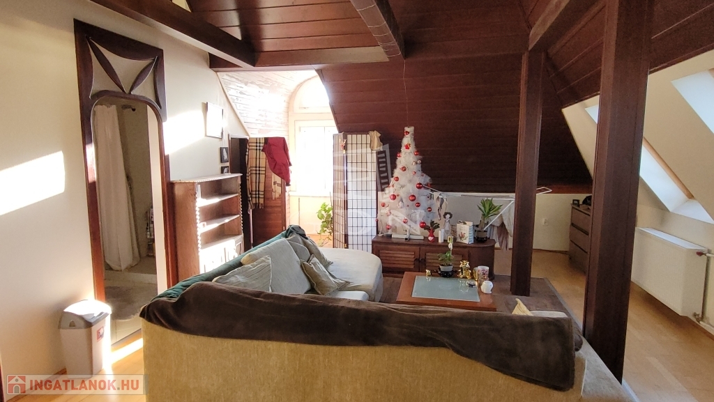 - Tetőtér (nettó 50 nm): nagy belmagasságú tetőtér, nappali és egy hálószoba, gardrób, fürdőszoba.