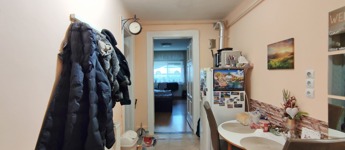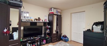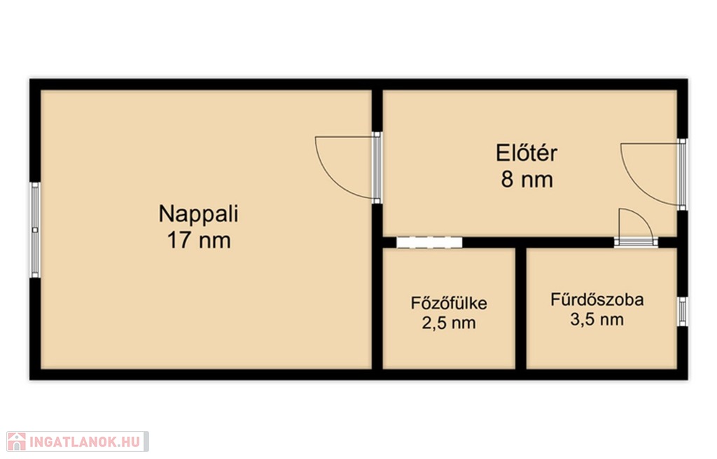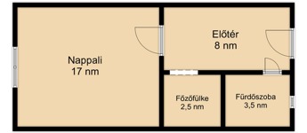 Belépve a lakásba a bejárattal szemben a 17 nm-es keleti fekvésű világos szobába juthatunk, ami reggelente fényárban úszik. A 8 nm-es járólapos előtérben balra nyílik a világos, kis ablakos 3,5 nm-es, csempézett épített zuhanyzós fürdőszoba, amely magában foglalja a WC-t is. Az előtérből tovább haladva szintén balra találjuk a 2,5 nm-es, gáztűzhellyel felszerelt, bútorozott főzőfülkét, amiben a mosógép is helyet kapott.